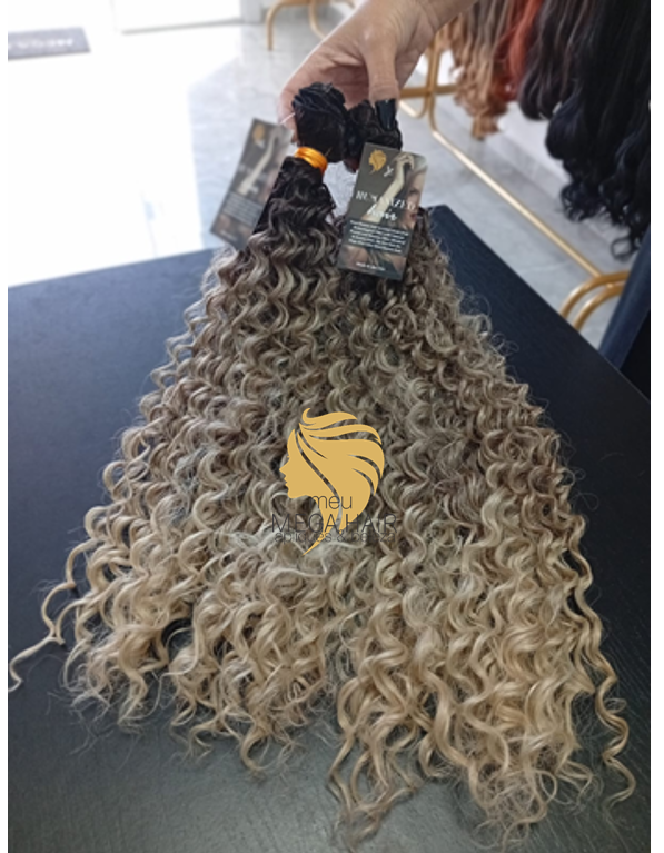 Aplique de Cabelo Cacheado Loiro Raiz Esfumada 60cm 100% Humanizado Fibra Russa na Tela